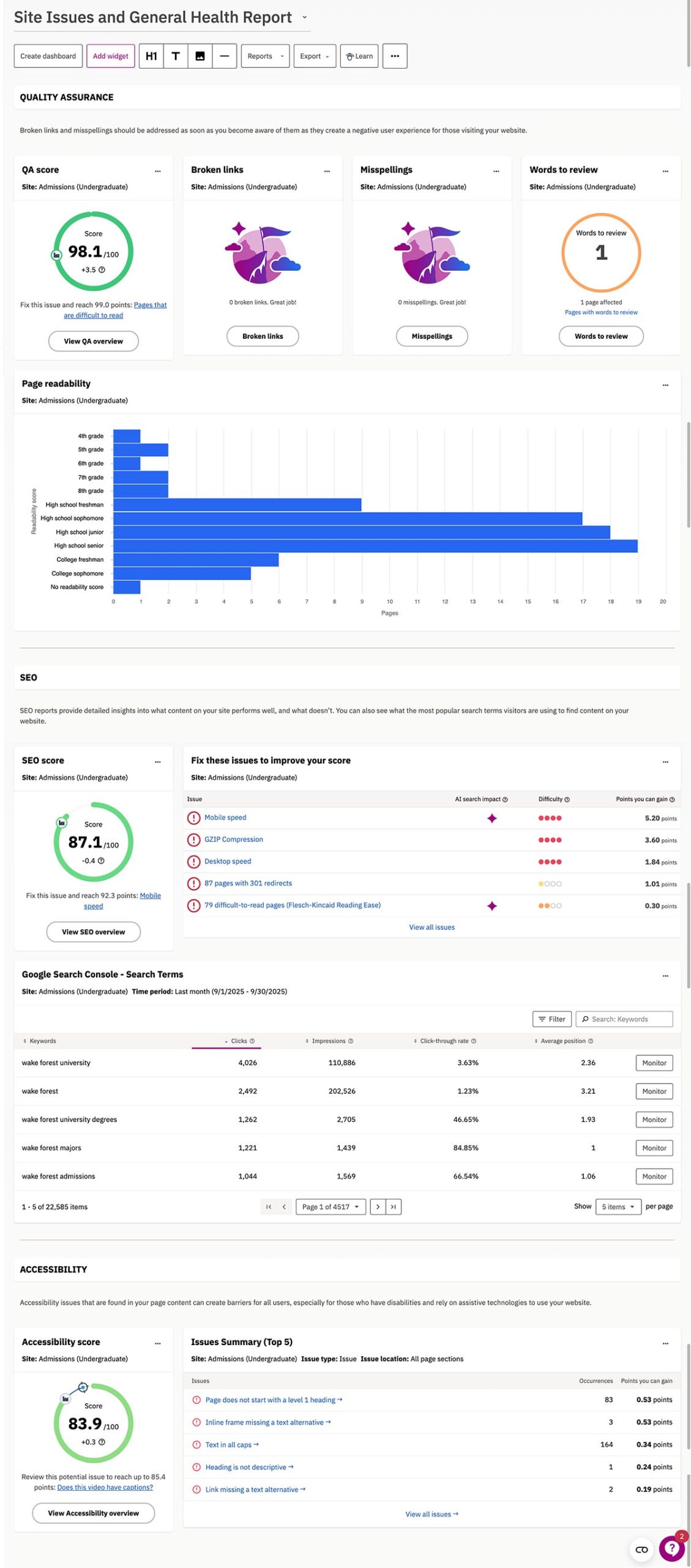 - You will no longer be sent the Quality Assurance Dashboard Report each month. Instead, you will receive the Site Issues and General Health Report. Unlike the QA Report that included everything found in the QA Dashboard, the Site Issues and General Health report contains a snapshot of your site’s performance and will help you see what the most important QA, SEO, and Accessibility issues are that may be creating a negative experience for your users.