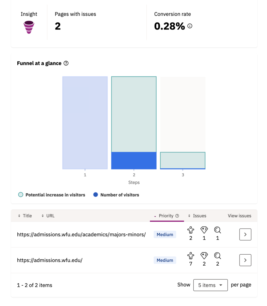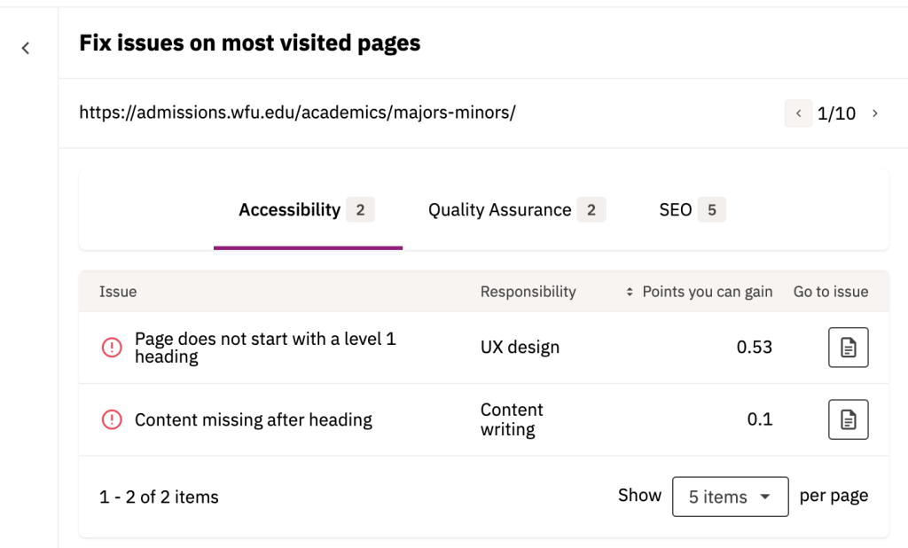 Improve website health provides insights on the most important content to fix on your site that are quality assurance, accessibility, and SEO-focused. These issues should be addressed quickly and take priority overall other issues as they impact the most users.