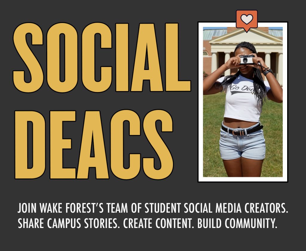 We’re building a team of students with a mix of skills and interests, from those who love creating videos from start to finish, to those who want to interview fellow students, to those who want to jump in on the fun as “extras” in the content we’re planning for Wake Forest’s primary social media accounts.